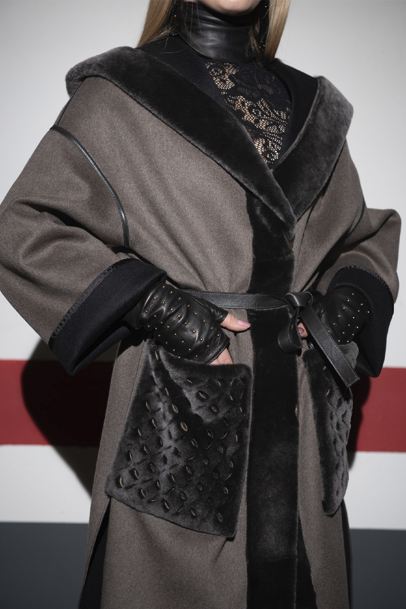 Abrigo de cashmere reversible con detalles de piel vuelta en vistas, bolsillos de plaston y capucha. Abrigo de corte oversize en color topo y negro que hace que sea una prenda formal y sport al mismo tiempo.