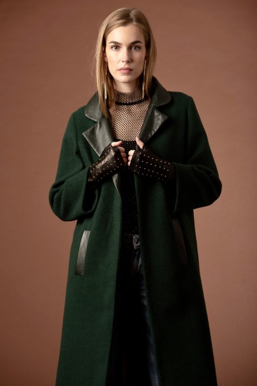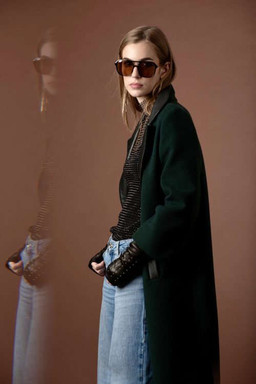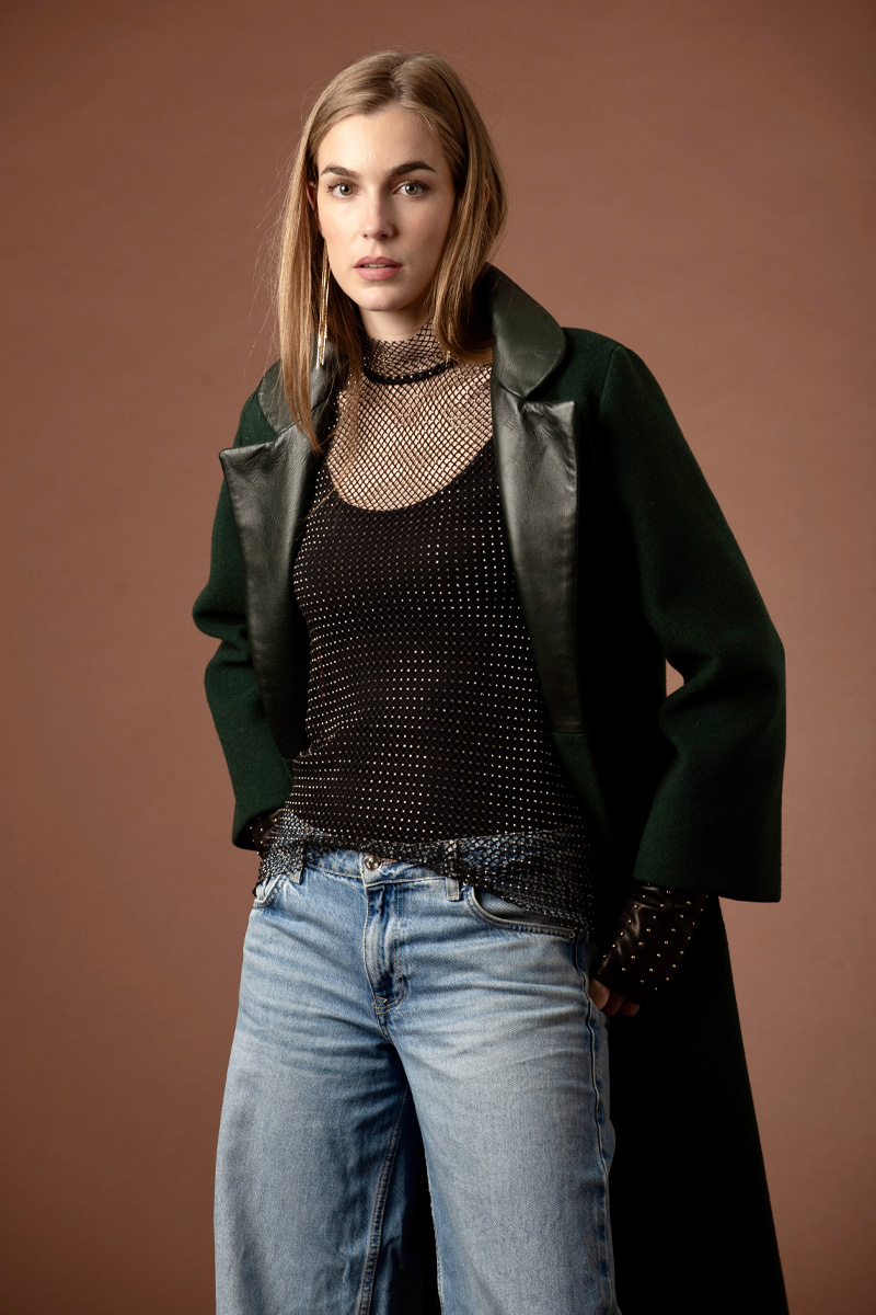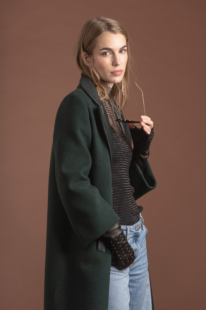 Abrigo recto con solapa. Este abrigo combina detalles de cuero en la solapa para crear una pieza contemporánea. Tiene un corte masculino y relajado que lo hace elegante. Sólo limpieza en seco con especialistas.