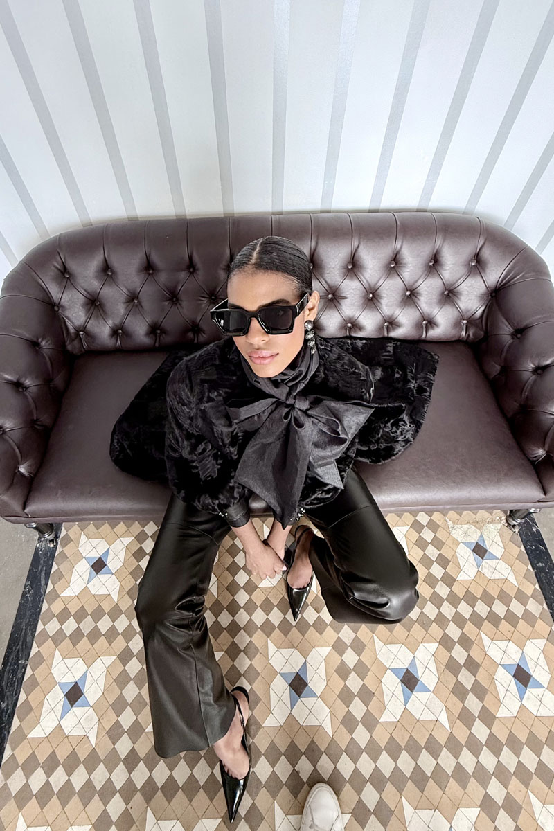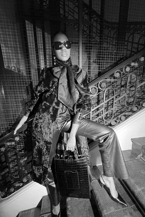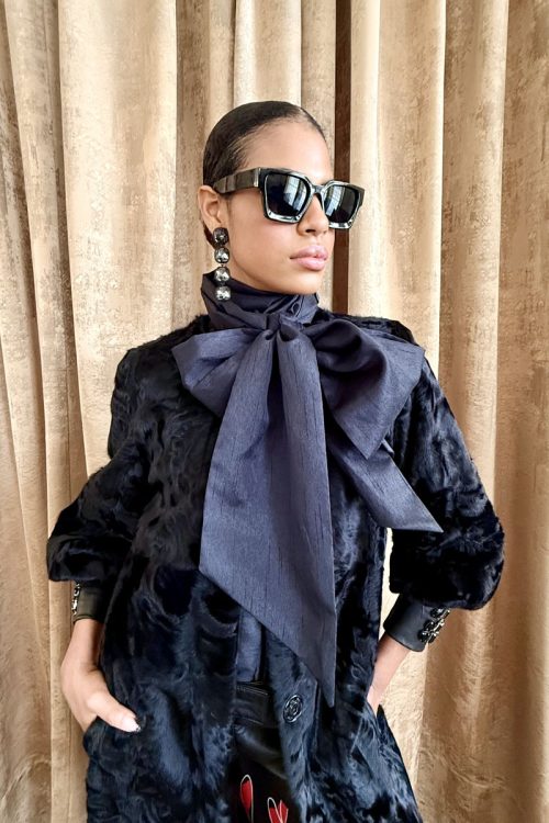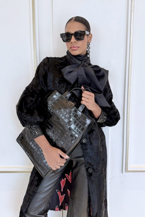 Abrigo de Indian Lamb en color negro con mangas abullonadas, puños de cuero con pedrería, cuello caja y forro interior estampado. Una prenda sofisticada y singular. La combinación de materiales y volúmenes en tono monocromático hace que sea una prenda especial y elegante.