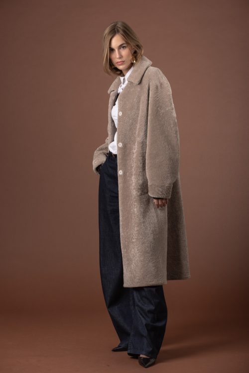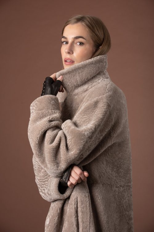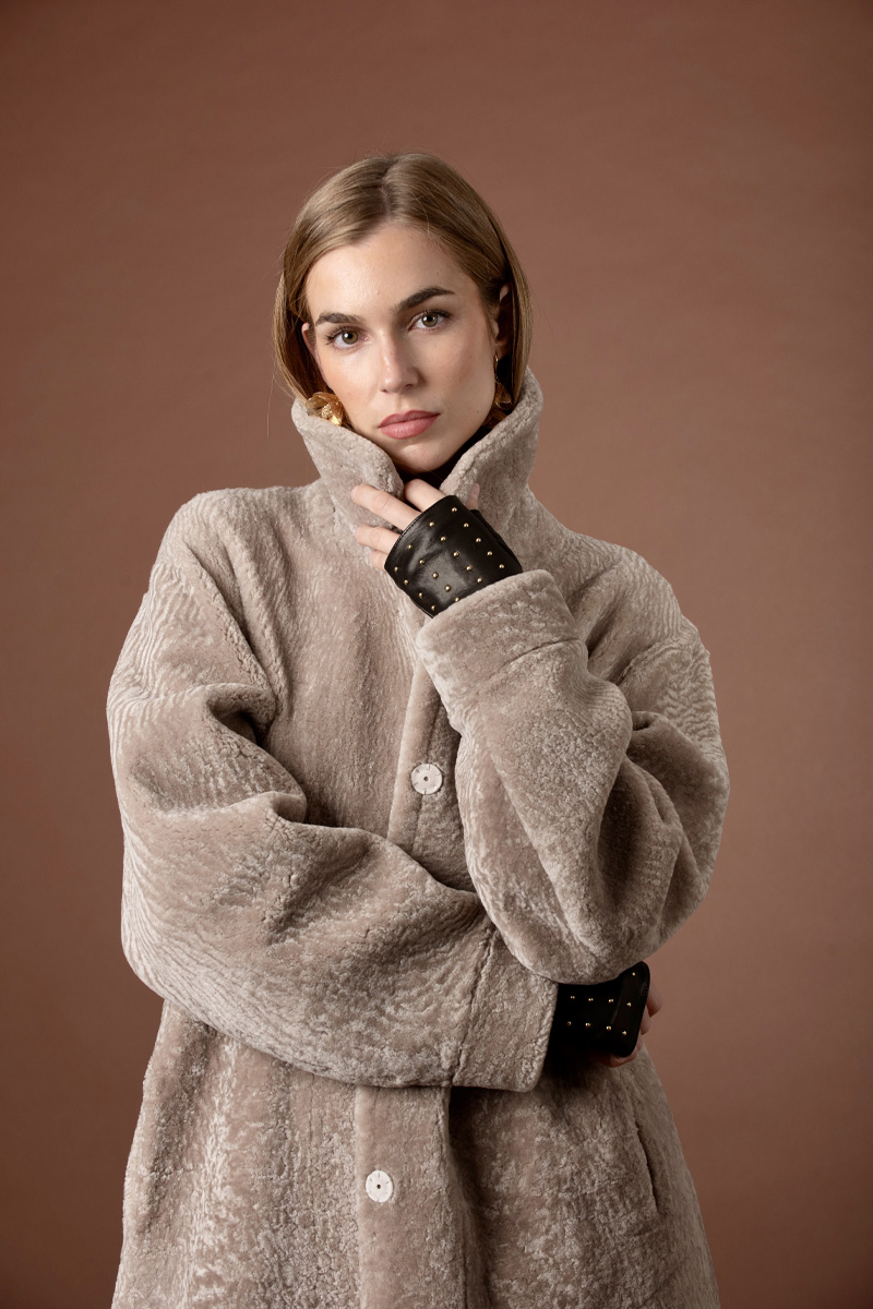 Abrigo de piel vuelta merino en color beige-nude. Su corte oversize con cuello chimenea, mangas caídas con puños y aberturas laterales, crea movimiento y un look juvenil y moderno.