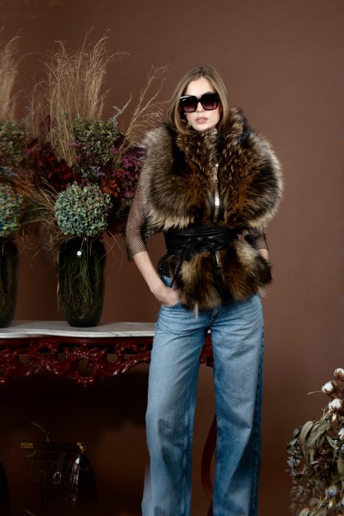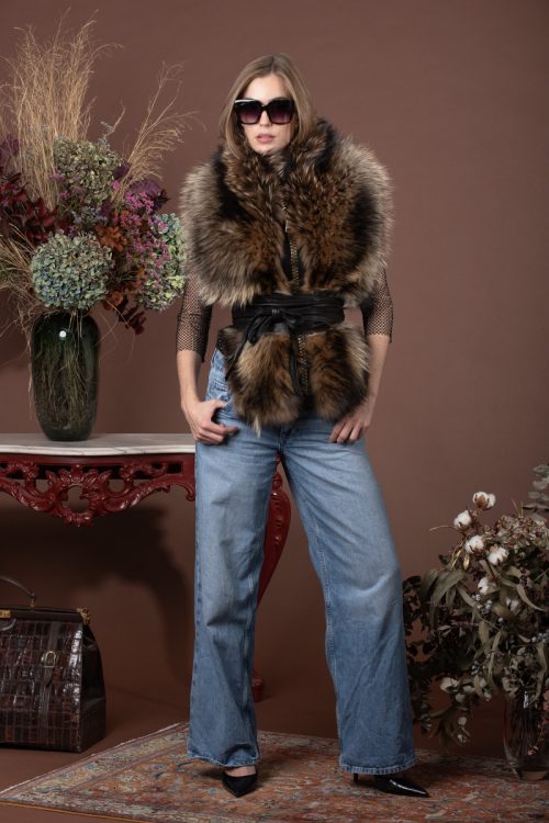 Cuello-Estola con cremallera extra grande multifuncional y detalles de cuero. Confección en marmota finlandesa en color natural. Acabada con forro liso. Hecho en España