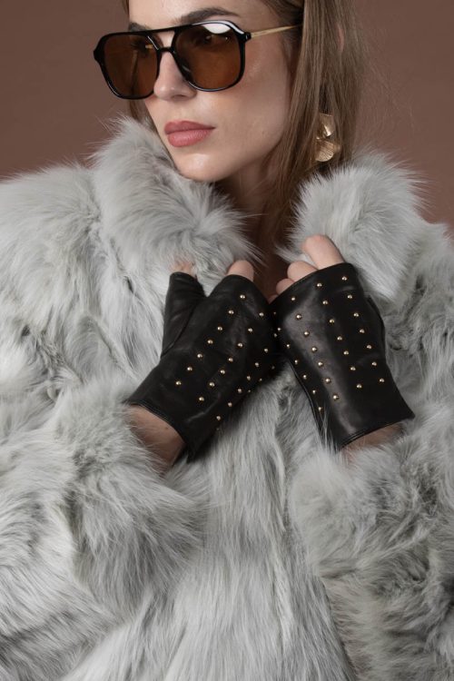 Los accesorios de cuero de la colección presentan los detalles de la Firma Gabriel. Estos guantes – mitones de color negro se complementan con tachuelas de metal dorado y exhiben un forro de seda.