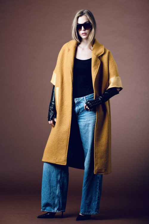 Completa tu look con un chaleco de lana con cuero amarillo.