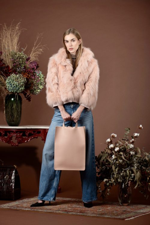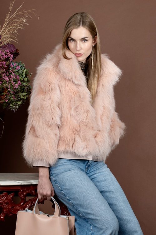 Completa tu look con una chaqueta bomber de zorro con cuero en color rosa.