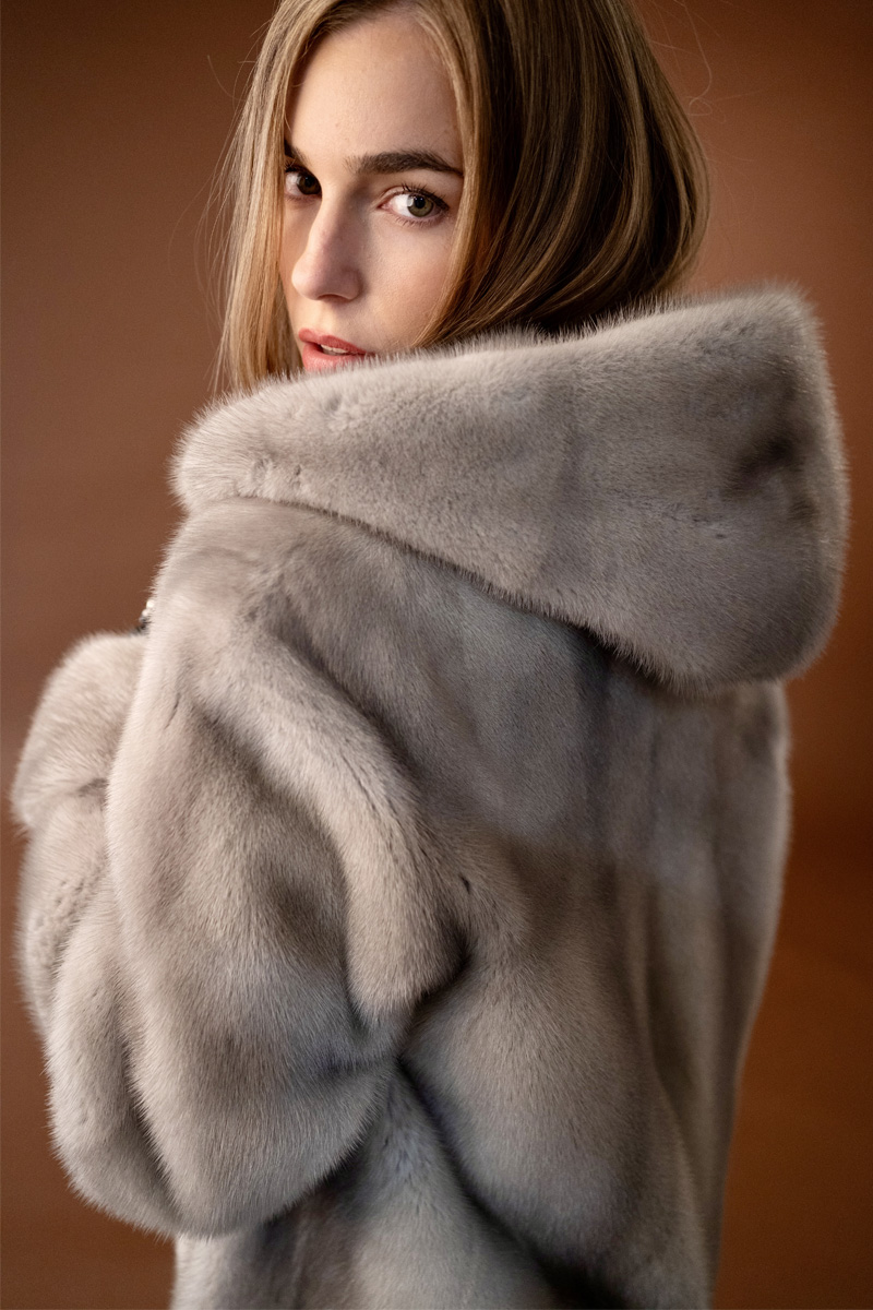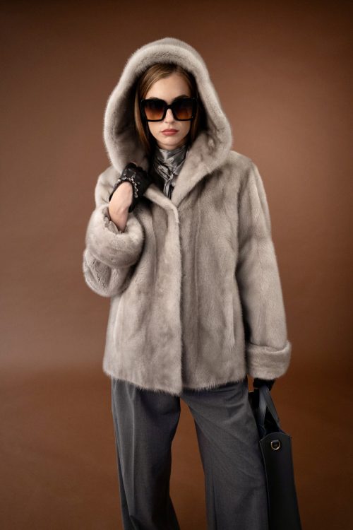 Completa tu look con una chaqueta de visón  con capucha en color gris