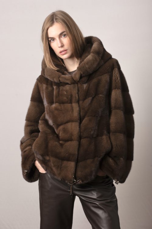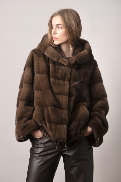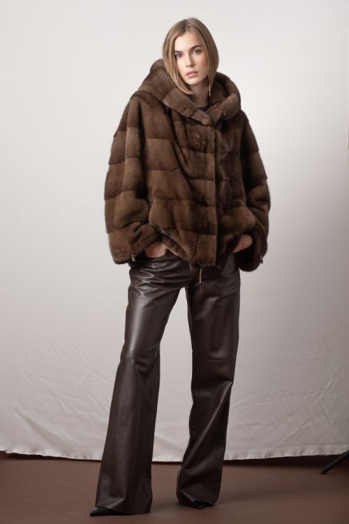 Completa tu look con una chaqueta de visón con capucha color natural