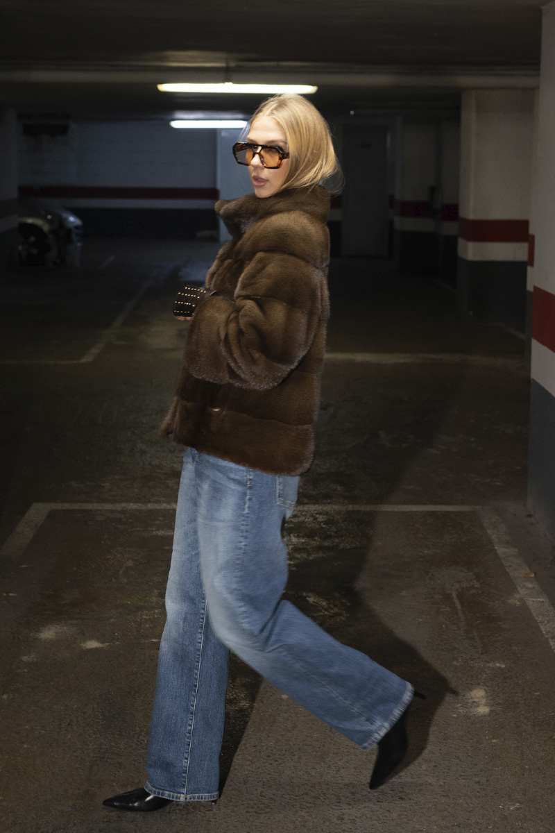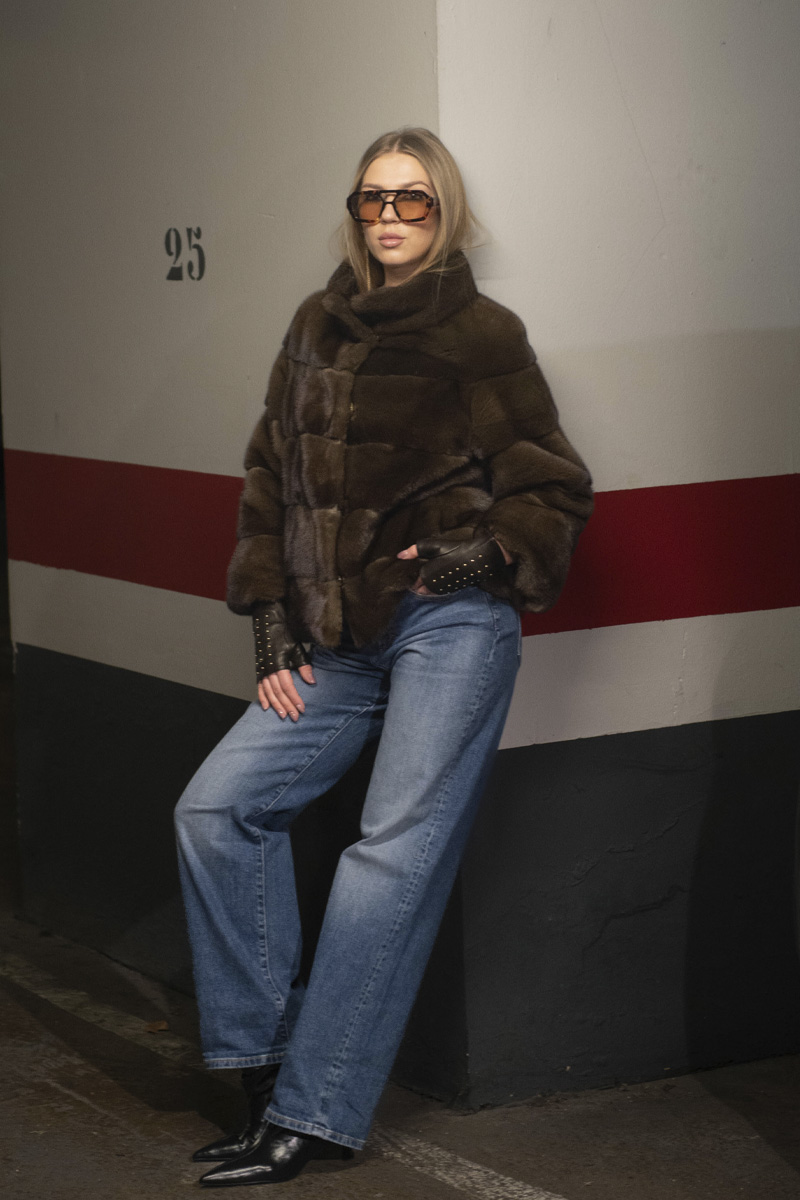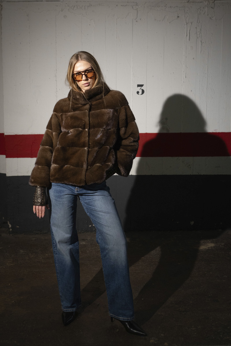 Chaqueta de visón reversible en color marrón con cuello chimenea y forro acolchado. Una prenda sport y singular. La piel trabajada en horizontal hace que sea una prenda juvenil y moderno.