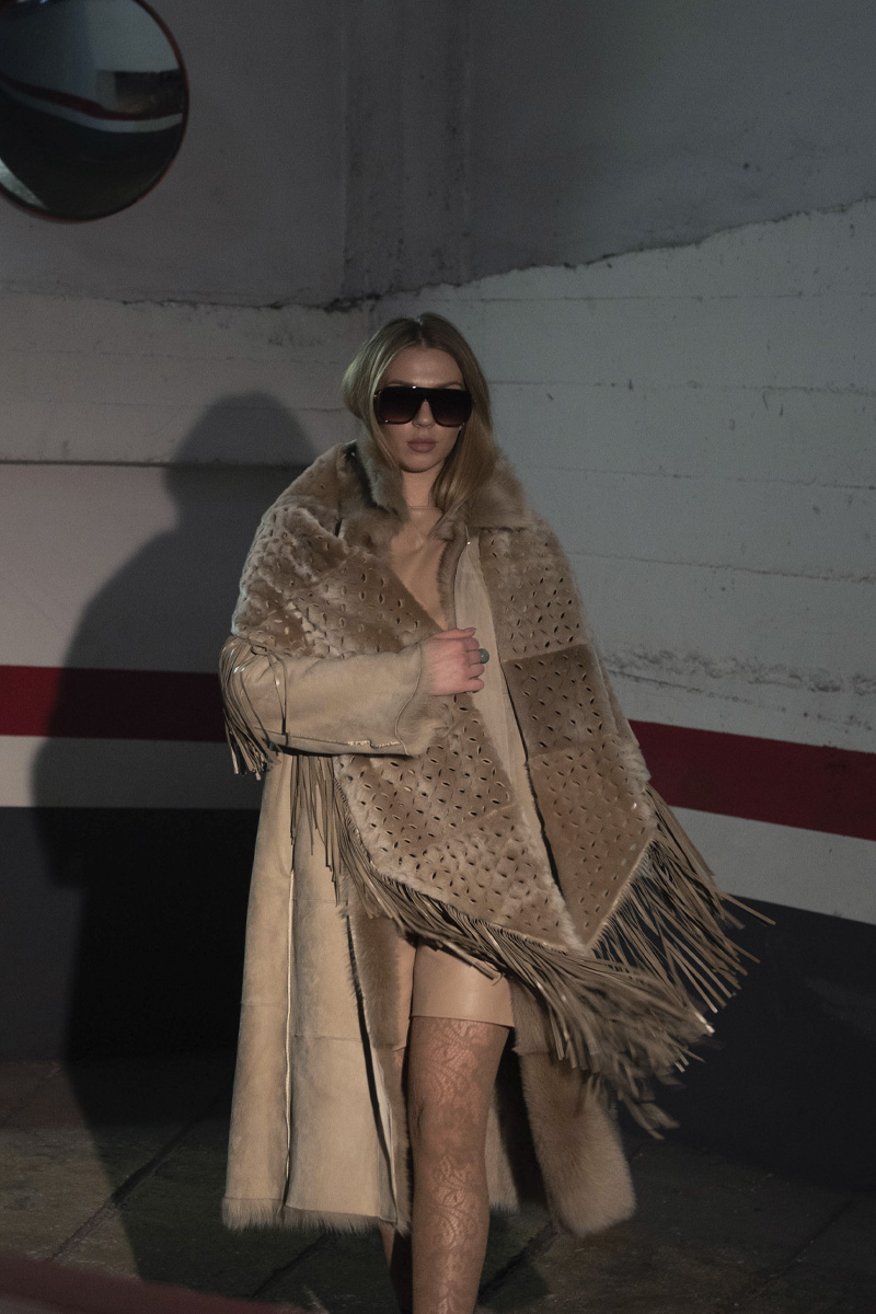Completa tu look con una estola de piel vuelta con flecos beige-camel