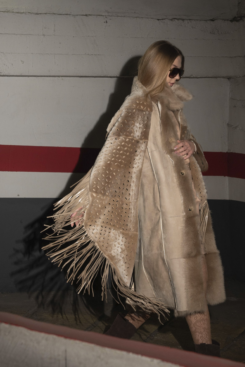 Estola de piel vuelta en color topo-marrón con flecos, delanteros y espalda con motivos perforados. Su color suave, los flecos y corte asimétrico crean una silueta moderna y juvenil.