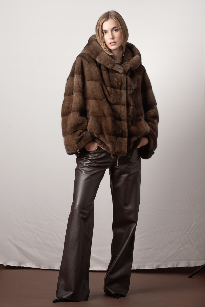 Chaqueta de visón con capucha color marrón