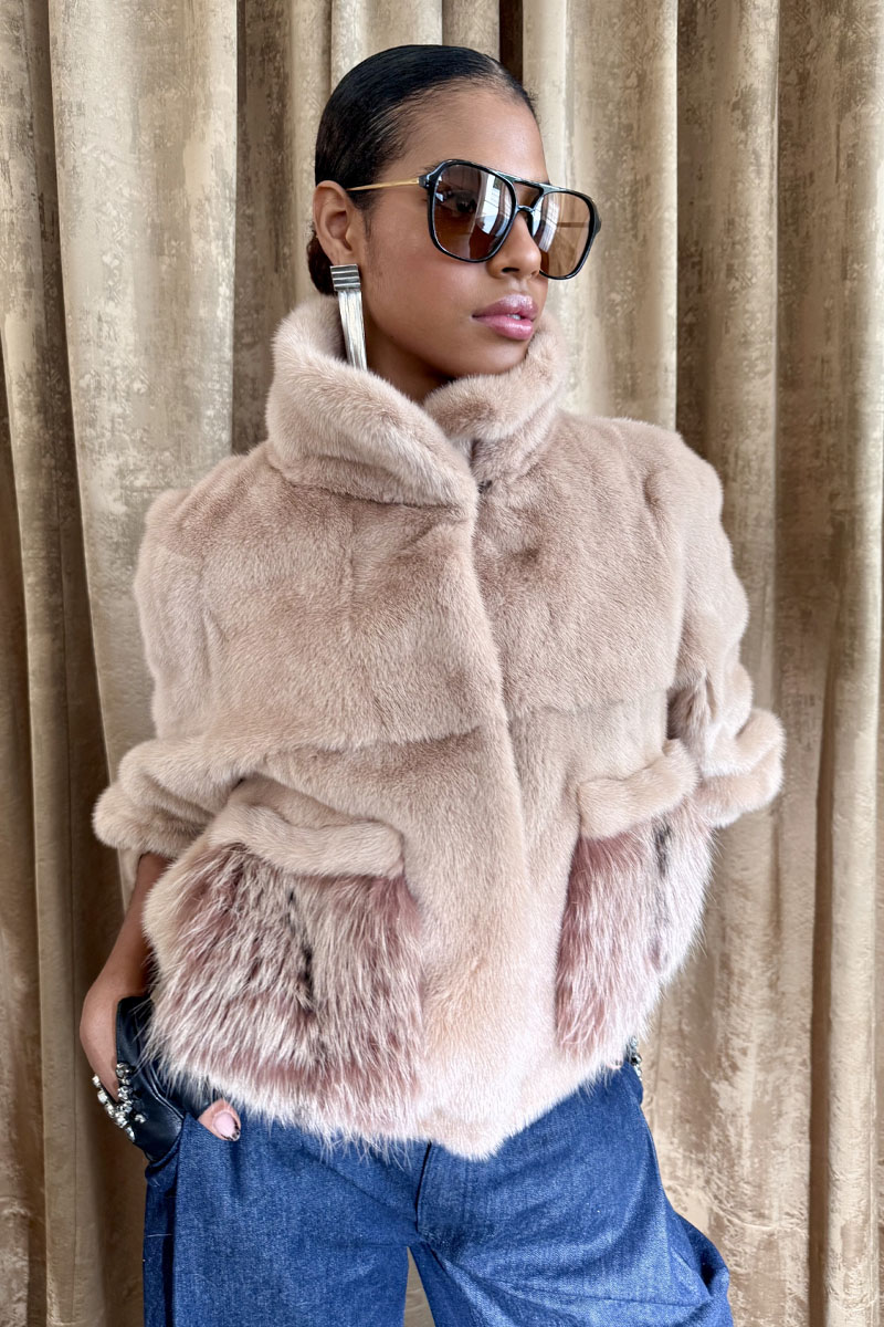 Abrigo de piel vuelta merino en color beige-nude. Su corte oversize con cuello chimenea, mangas caídas con puños y aberturas laterales, crea movimiento y un look juvenil y moderno.- Abrigo de cordero merino