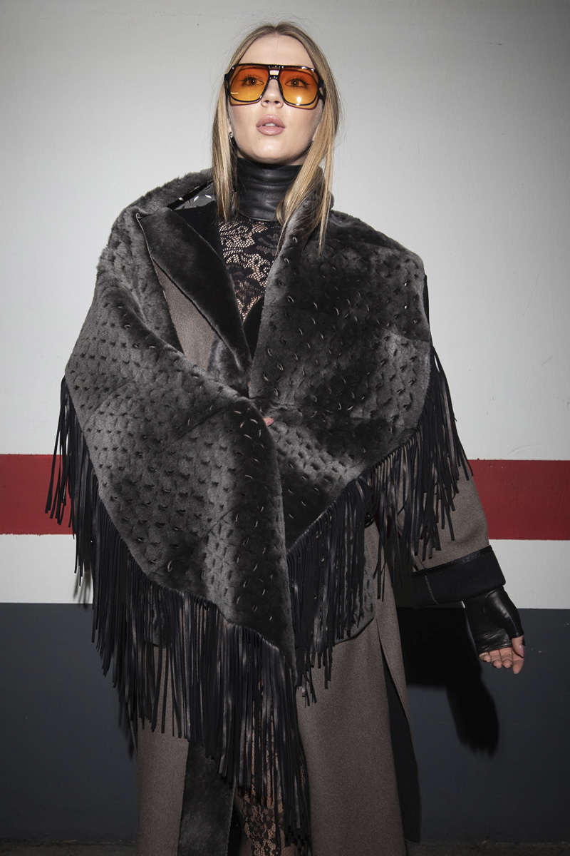 Estola de piel vuelta con flecos color topo-marrón