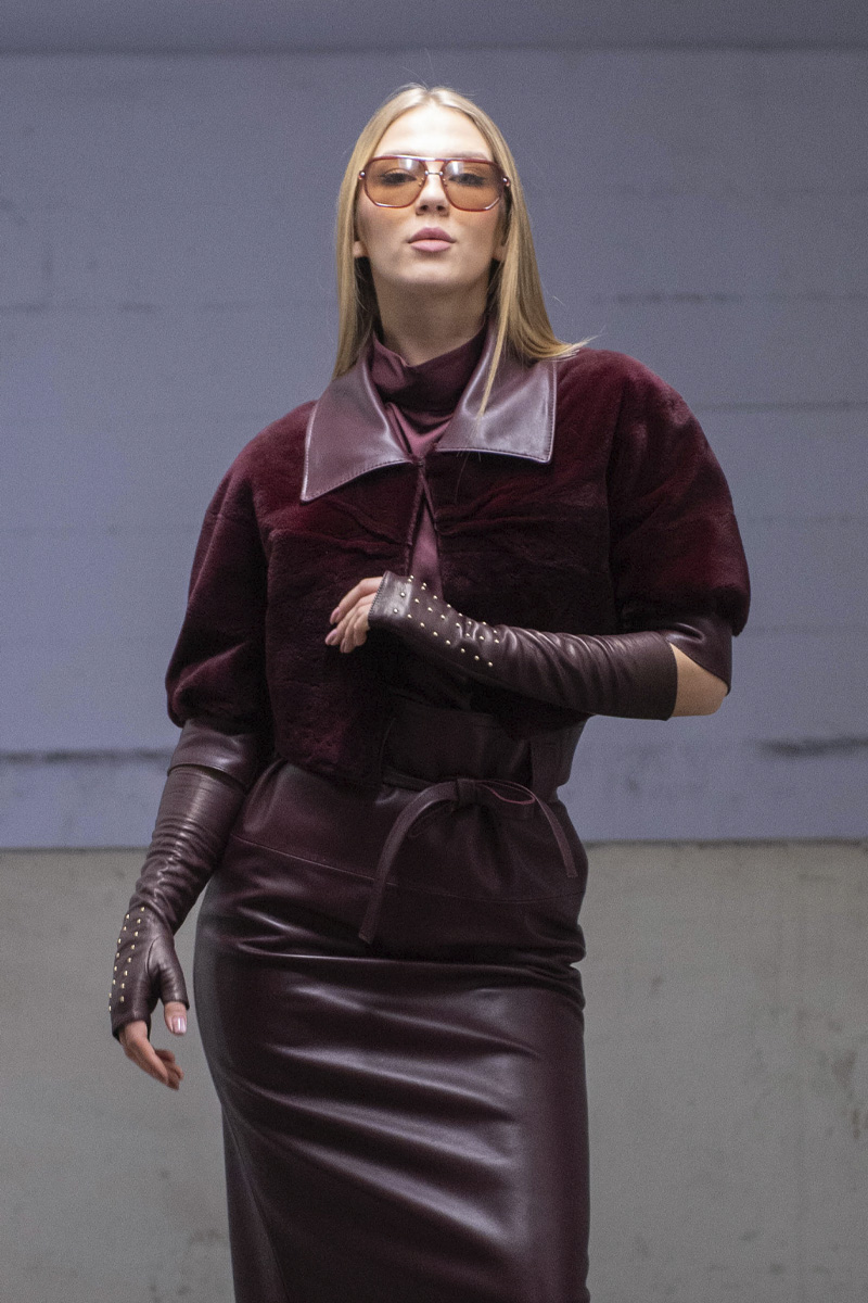 Chaqueta de visón rasado con cuero en color burdeos-granate